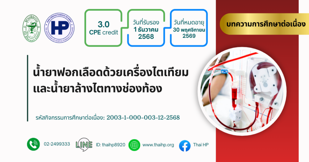 น้ำยาฟอกเลือดด้วยเครื่องไตเทียมและน้ำยาล้างไตทางช่องท้อง ๋24 ก.พ. 2026๋24 ก.พ. 2026 HPadmin บทความการศึกษาต่อเนื่อง Article_CPE_i1Article_CPE_i2Article_CPE_i3Article_CPE_i4 อ่านบทความนี้ HPadmin